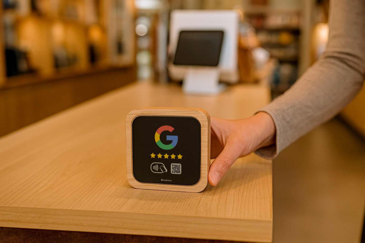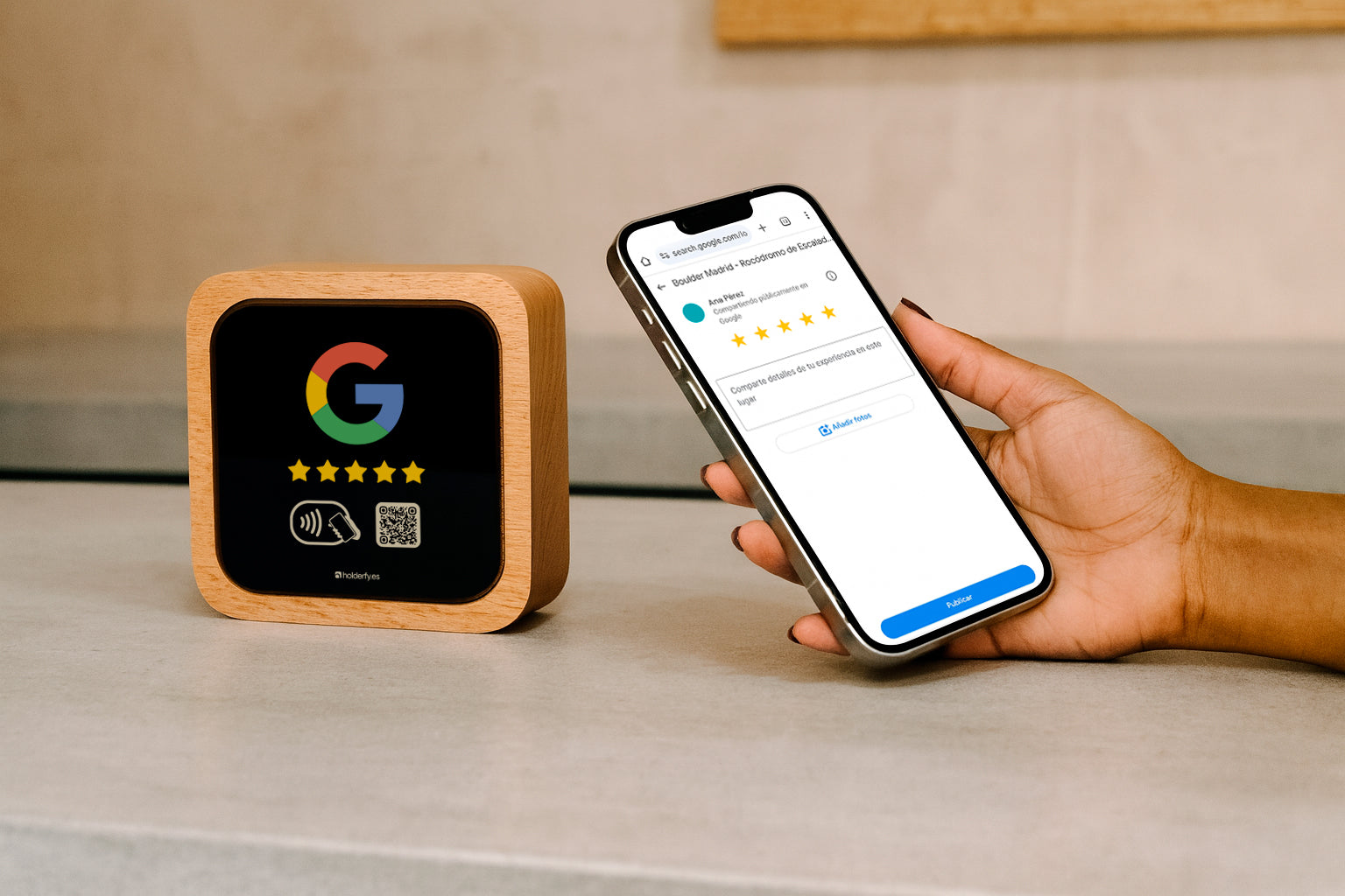 Sí. Holderfy está diseñado para que el cliente deje su reseña en el momento justo: cuando la experiencia aún está fresca. Los negocios que ya lo usan ven un incremento significativo en reseñas positivas porque el dispositivo es visible, elegante y fácil de usar. Solo tienes que mostrarlo y el cliente accede directamente al enlace de tu ficha de Google con un toque o un escaneo.